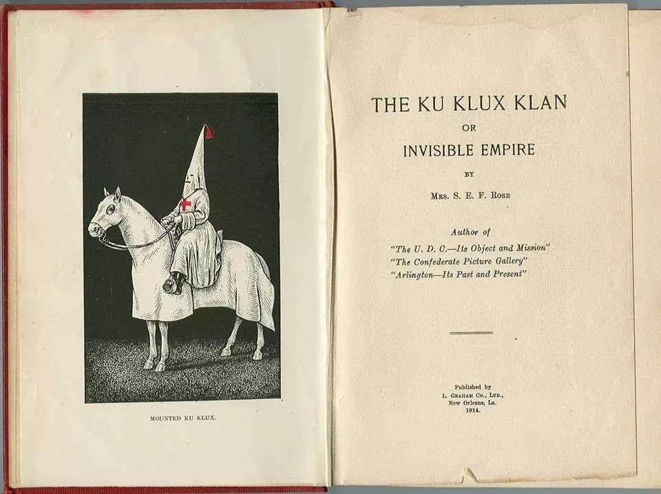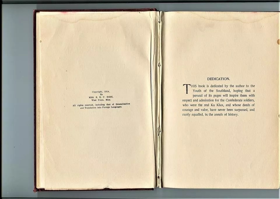 “This book is dedicated by the author to the Youth of the Southland, hoping that a perusal of its pages will inspire them with respect and admiration for the Confederate soldiers, who were the real Ku Klux Klan, and whose deeds of courage and valor, have never been surpassed, and rarely equalled, [sic] in the annals of history,” it reads.