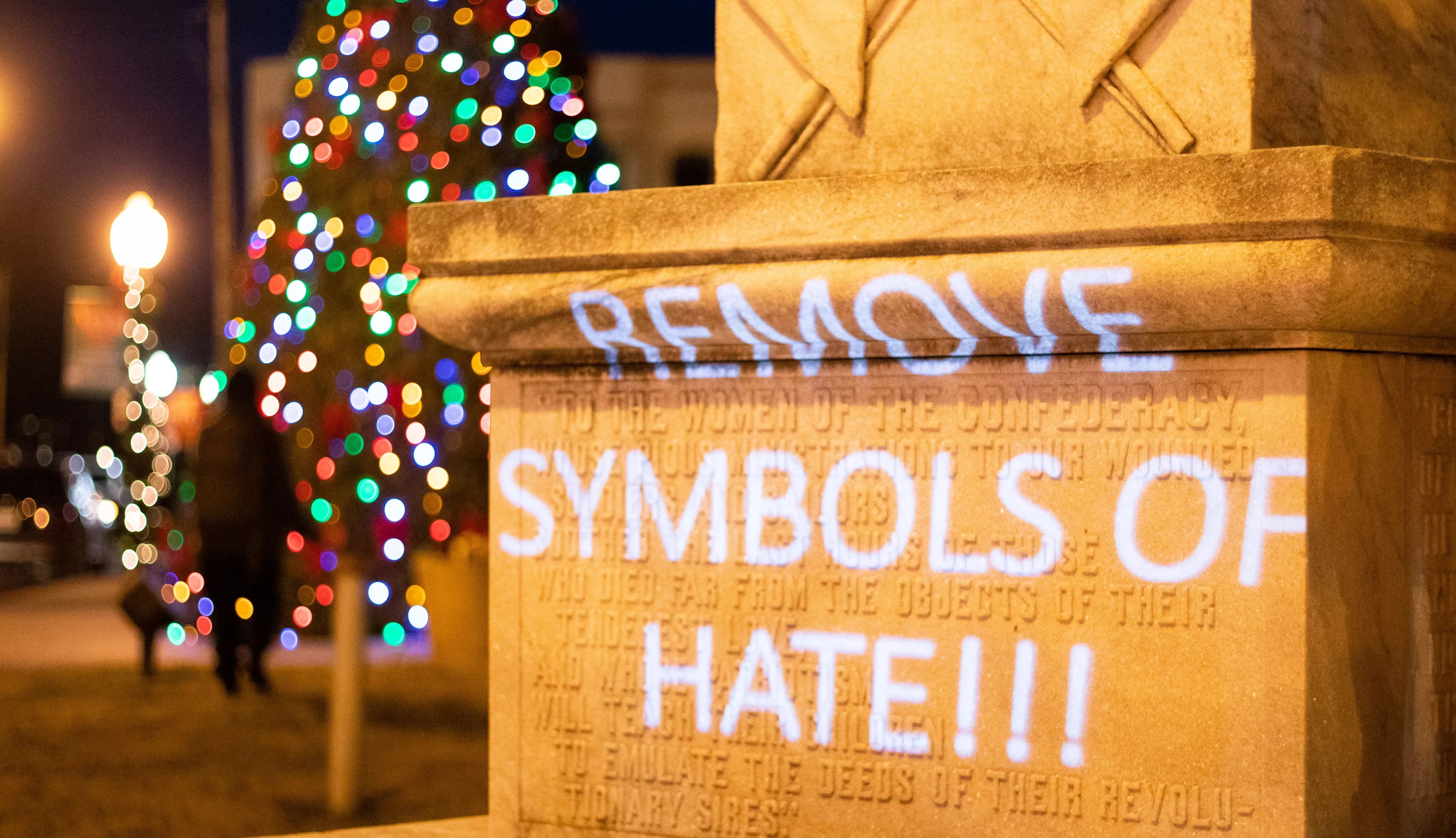 After dark, protesters began projecting images onto the statue including phrases such as, “IS THIS HOW YOU WANT TO BE REMEMBERED?” and, “REMOVE SYMBOLS OF HATE!!!”