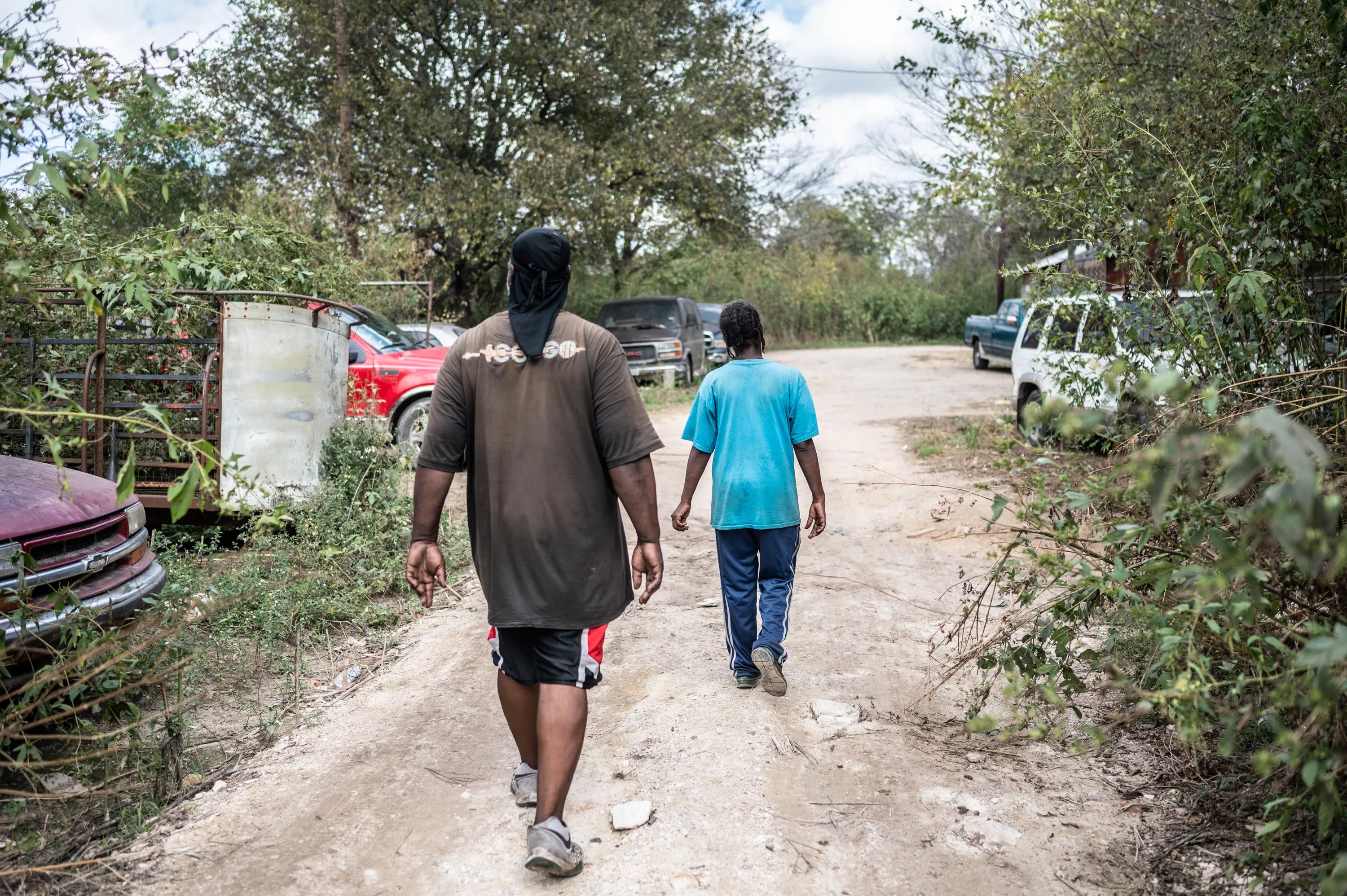 Darwin Shipman (right) and Mahogany Nunnally walk around their property in a part of Sandbranch people call the bottoms.