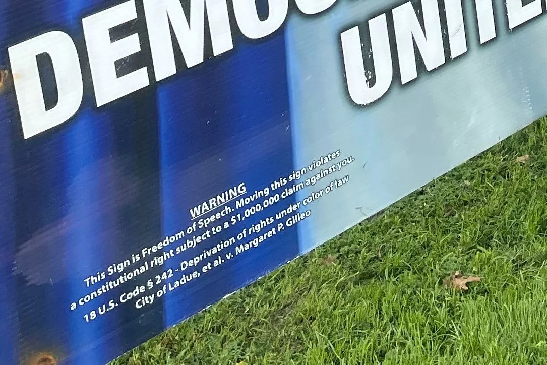 Some teeny-tiny text in the display’s bottom left corner reads: “WARNING. This Sign is Freedom of Speech. Moving this sign violates a constitutional right subject to a $1,000,000 claim against you.”