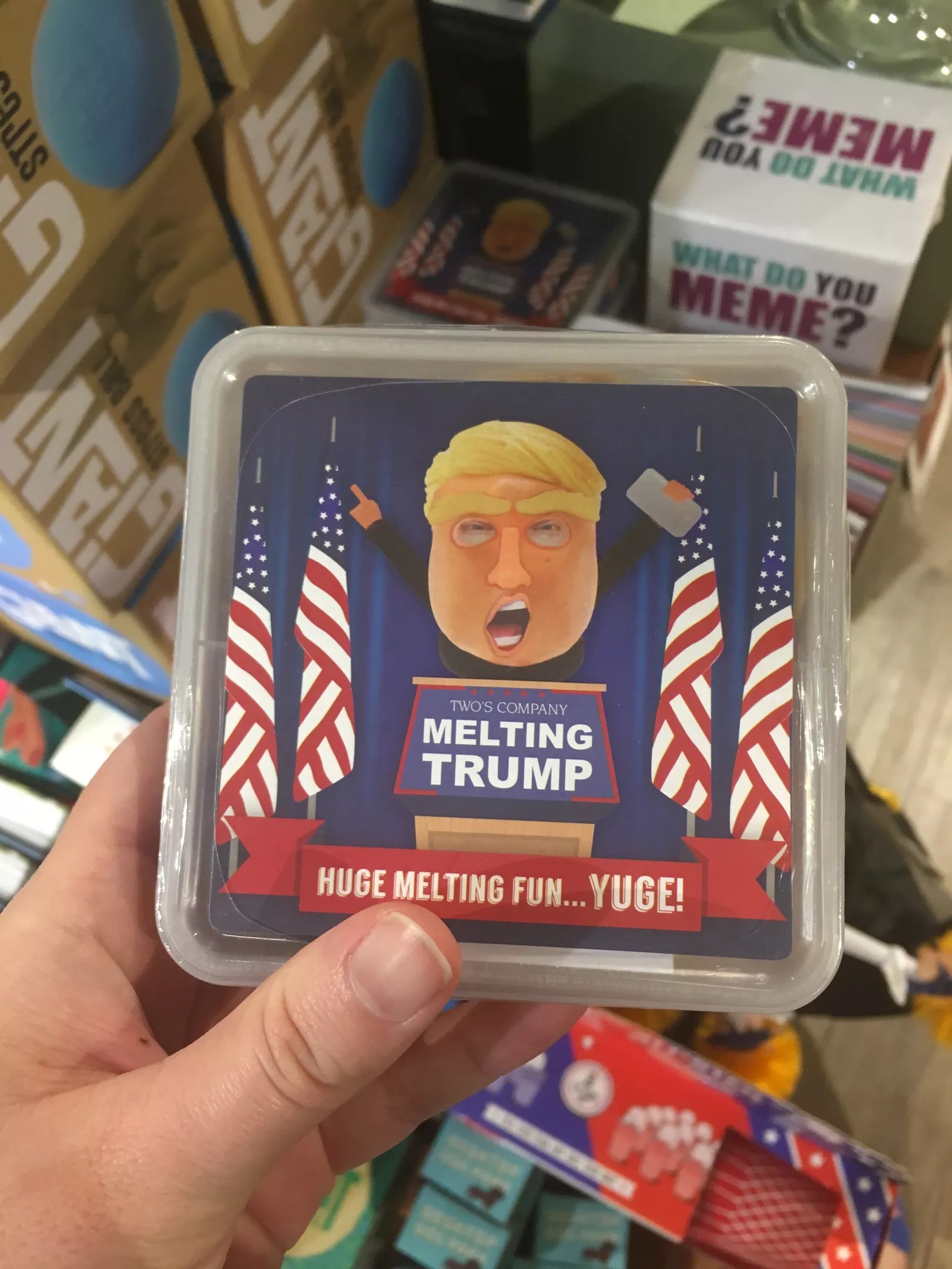 Repeatedly Melting Donald Trump: For the discerning gift giver looking to give loved ones a little bit of stress relief, there is this melting putty Donald Trump figurine. A Mr. Potato Head for grownups, this kit comes with putty you can meld into a head along with tiny hair, eyebrows, eyes, ears, nose, mouth, and arms and legs. Simply mash the putty into a face shape, assemble and watch it melt.