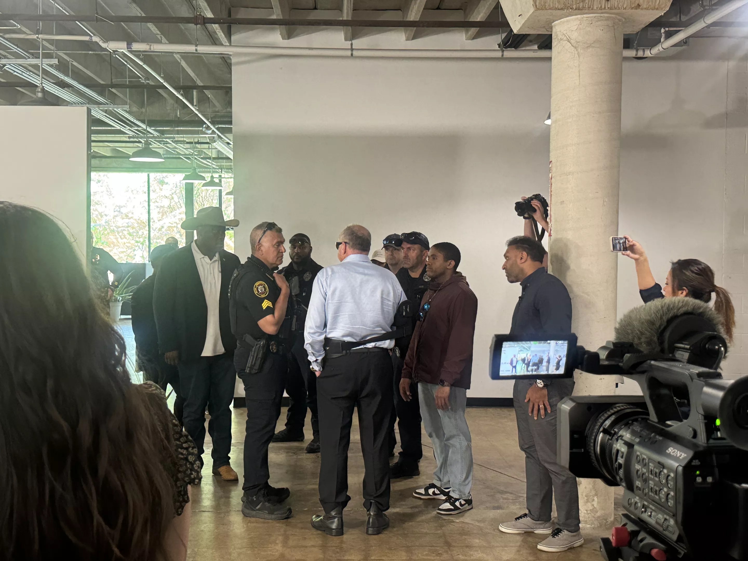 Austin Metcalf’s father, Jeff Metcalf (middle with back to camera), was asked to leave the press conference.