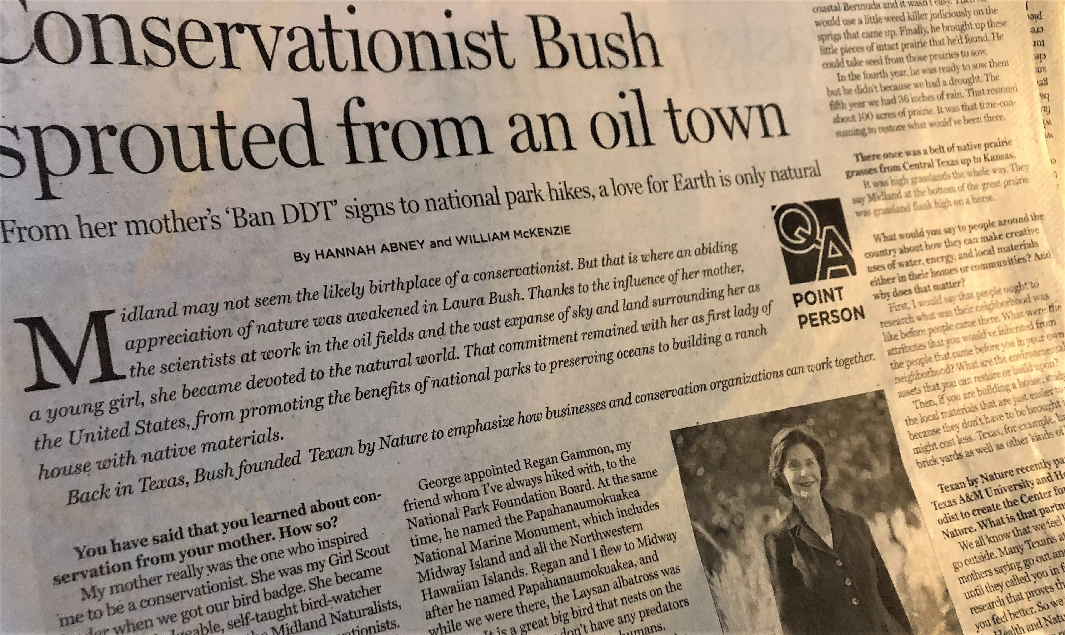 A recent Sunday editorial section was typical. It was book-ended between the regular weekly installment written by an employee of the Bush Center on how great Laura Bush is (“Conservationist Bush sprouted from an oil town”) to the regular weekly installment written by an employee of the Bush Center on how great fossil fuels are (“Don’t waste planet’s time arguing”).