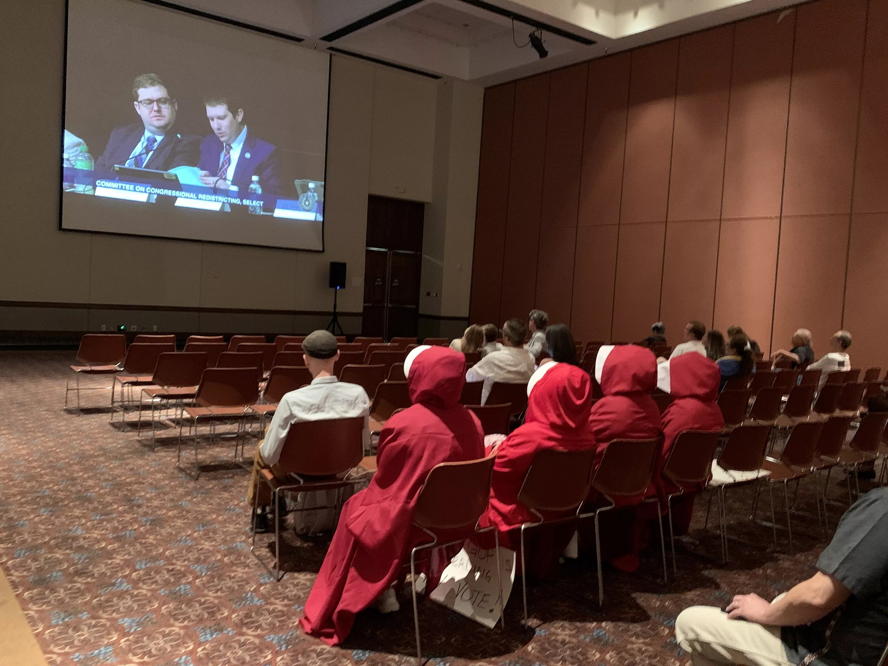 A group of women wearing outfits inspired by the book and TV show The Handmaid’s Tale watch the hearing from an overflow room.