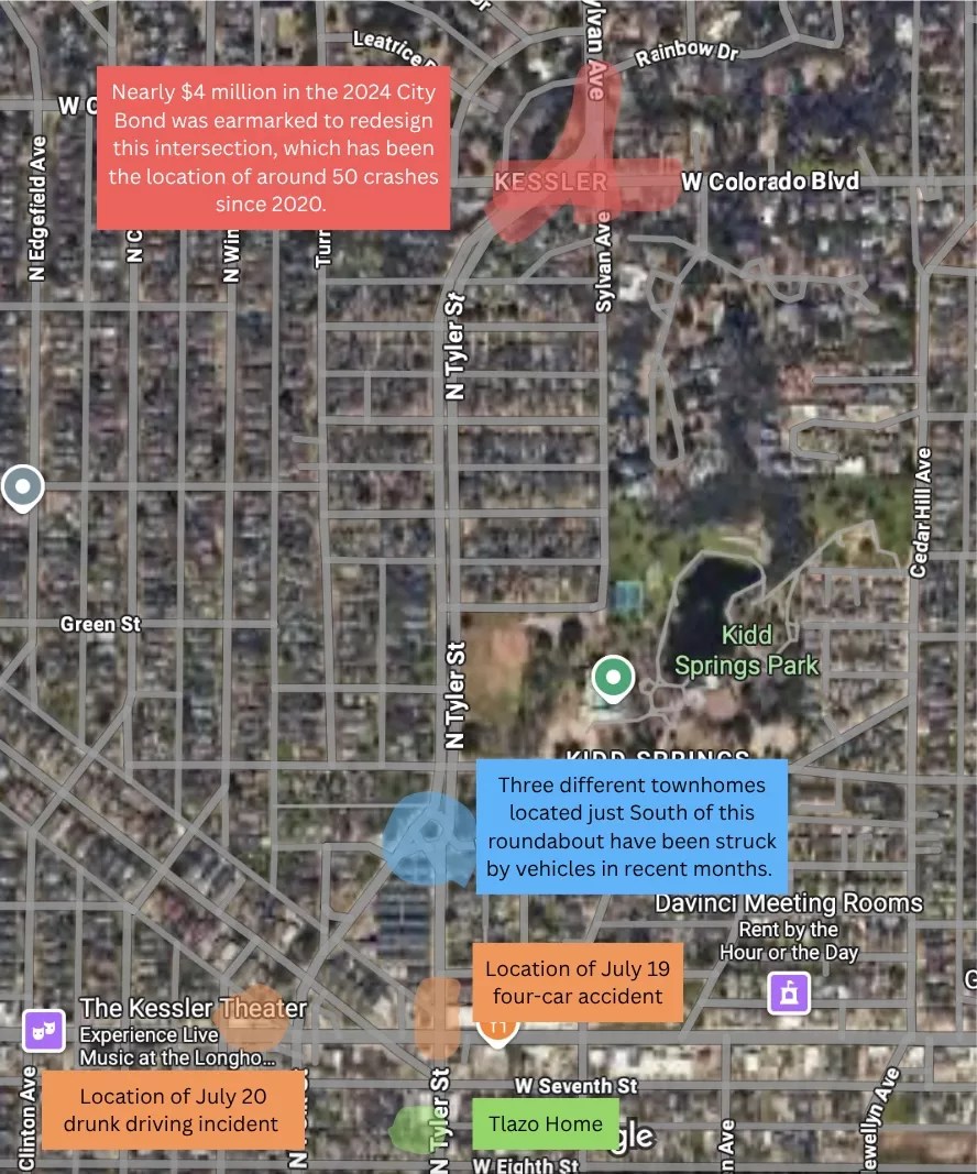 On the road’s northern end, where Tyler emerges from Sylvan Avenue after intersecting with Colorado Boulevard, it takes only a smattering of rain before the junction turns into a vehicular slip-and-slide. The road straightens out when heading south towards Kidd Springs Park – a straight that seems to inspire drivers of all kinds to gun it. A sudden roundabout just after the park serves, for most, as a traffic calming measure. But for the truly ambitious, it’s a launching pad into the adjacent townhomes, an accident you wouldn’t believe has happened twice this year if the footage hadn’t made it onto CNN.
