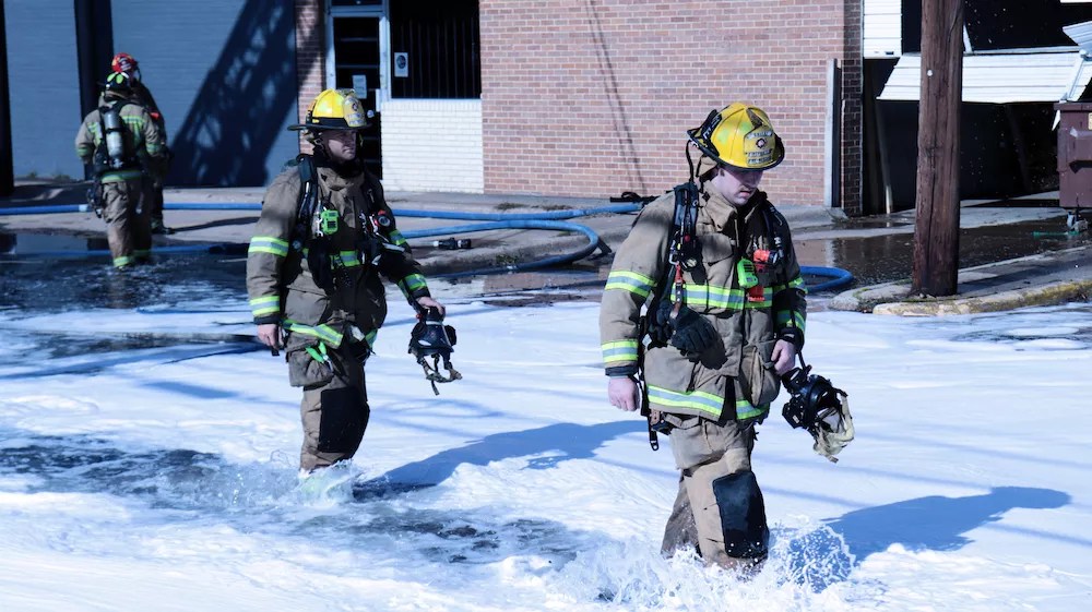 Dallas firefighters wade through water and foam flowing from their efforts to quench a warehouse fire in the Design District.