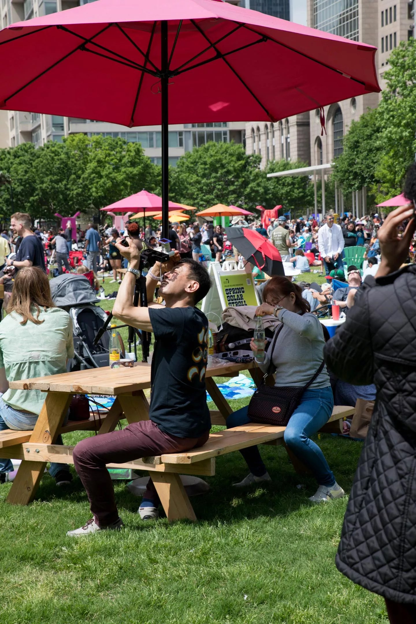A view of the eclipse of the Statler Hotel during Downtown Dallas Inc.’s party at Main Street Garden, April 8, 2024.
