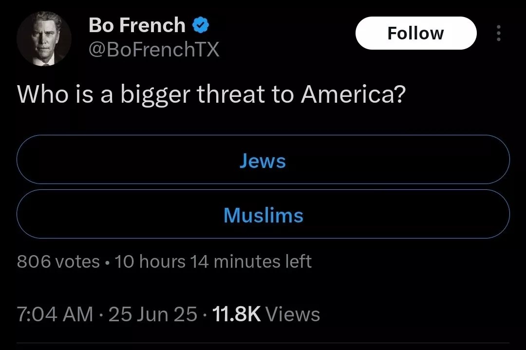 In response to Zohran Mamdani, a Muslim, winning the Democratic primary in the New York City mayor’s race, French tweeted a poll to X that asked, “Who is a bigger threat to America?” The options listed were “Jews” and “Muslims.” The poll has since been deleted.