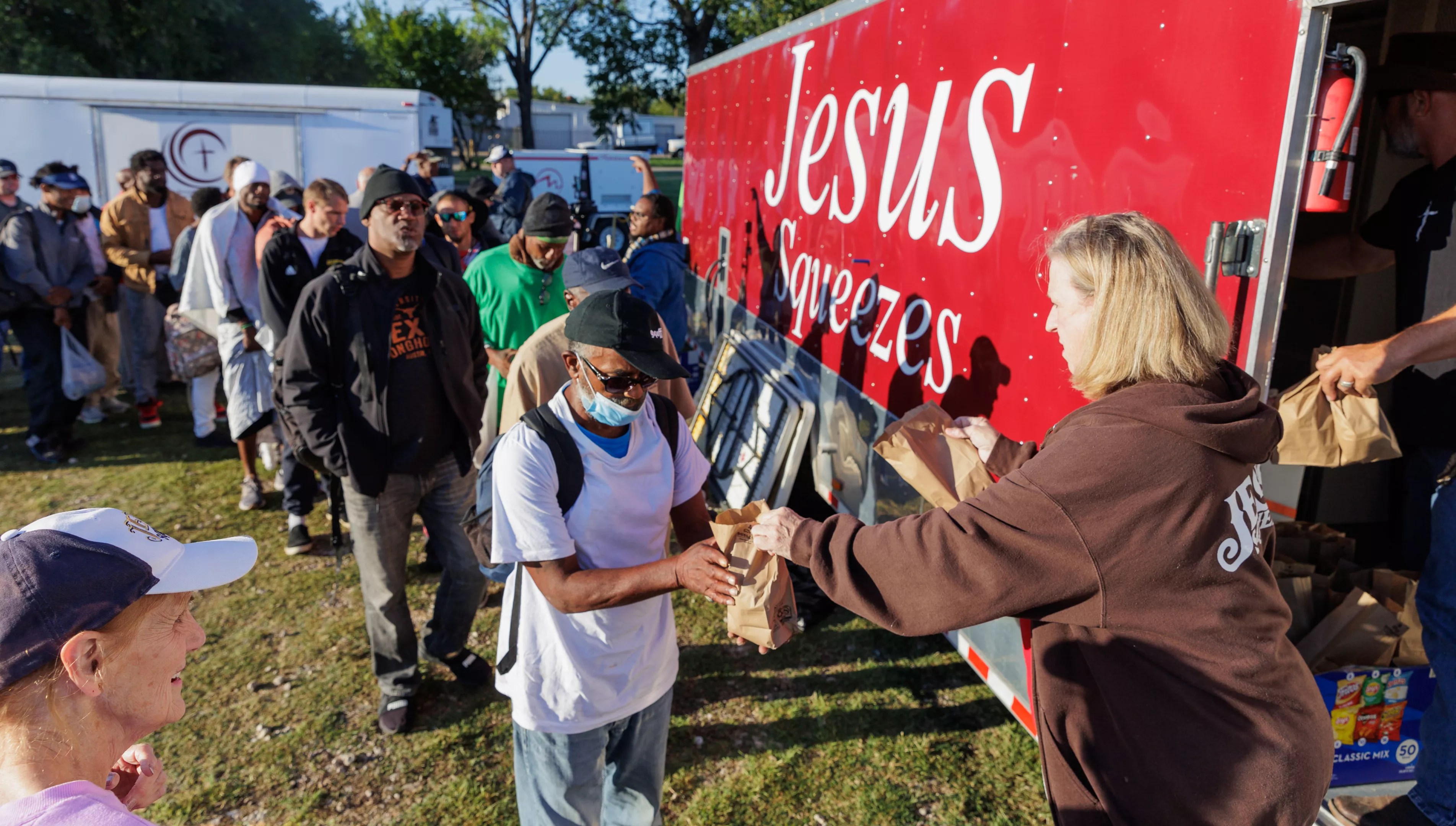 Birdd is one of the main faces behind S.O.U.L. Church, alongside his wife, Jennifer. S.O.U.L stands for Servants Of oUr Lord. The church has no roof or walls. Every Sunday morning, S.O.U.L. Church meets outdoors on a lot near Fair Park to feed the homeless. The church has from 30 to 40 volunteers who help feed some 250 people every Sunday. Many of those in attendance are wearing T-shirts and jeans or shorts. Some of them can be seen sleeping through the Sunday service, but plenty of others are willing, active participants.