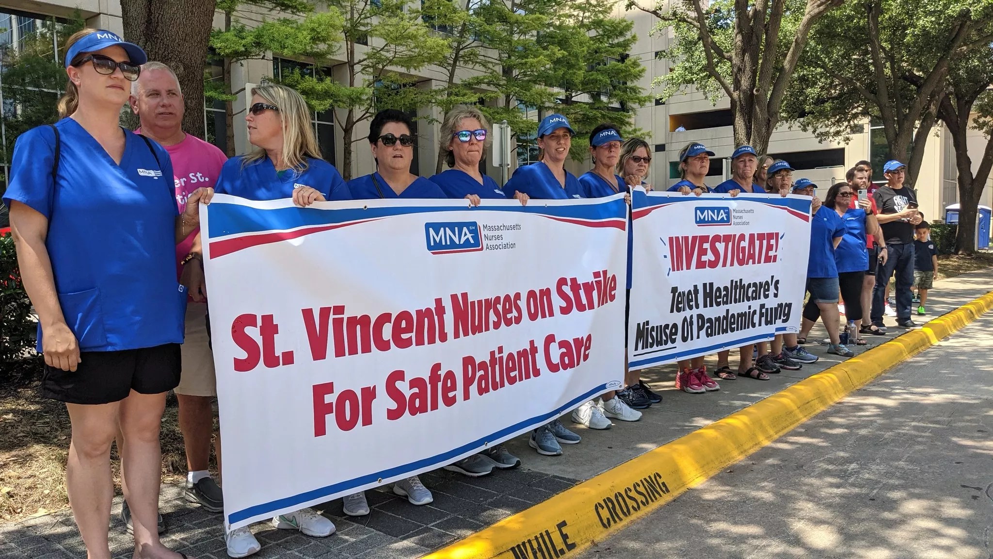 Throughout the day, dozens of nurses rallied outside the headquarters of Tenet Healthcare, a Dallas-based for-profit company. The Massachusetts Nurses Association (MNA) has been locked in battle with Tenet Healthcare executives for more than two years.