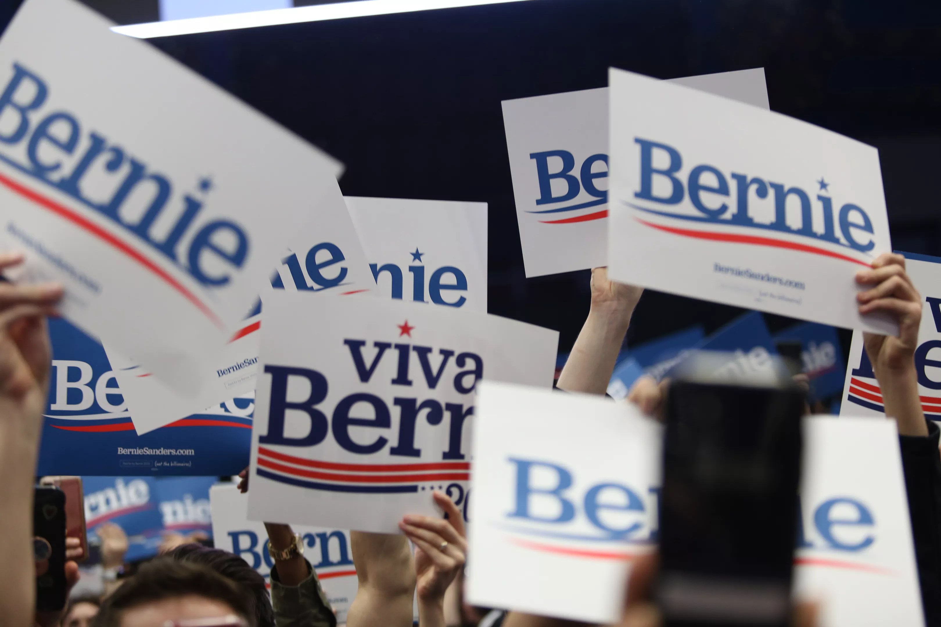 Attendees of Sanders’ Valentine’s Day visit to North Texas chant “Bernie! Bernie! Bernie!” as he makes his way to the lectern to speak.
