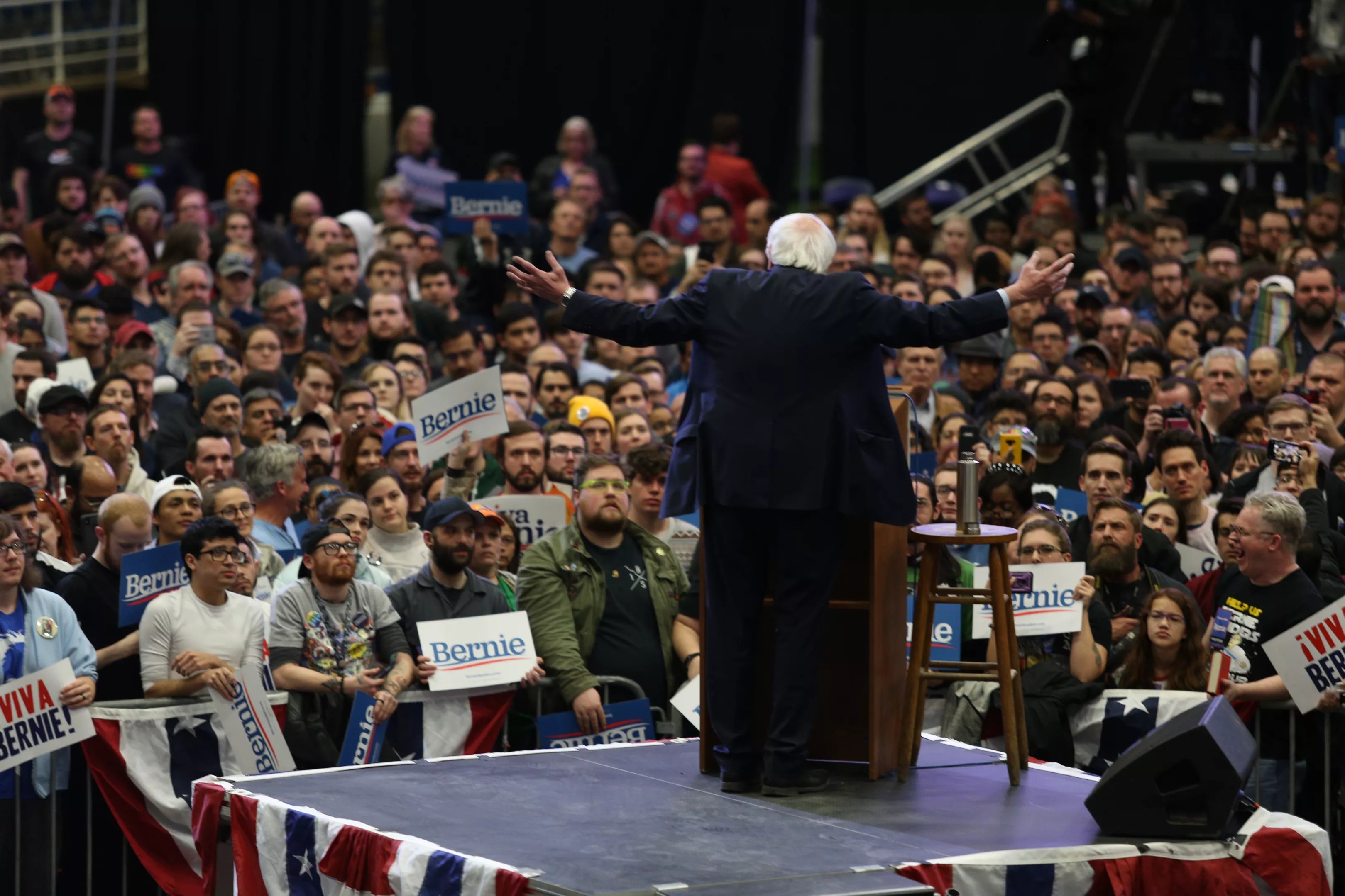 A crowd of more than 5,000 people roared as Democratic presidential hopeful Bernie Sanders stepped out from behind a curtain Friday night and made his way to the lectern at Mesquite Arena.
