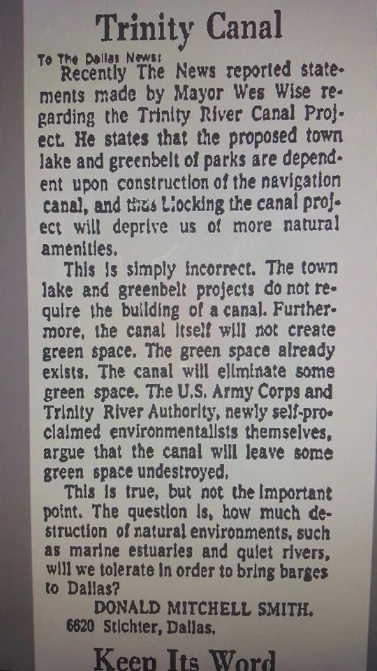 It was a letter to the editor of The Dallas Morning News complaining about then Dallas Mayor Wes Wise, who apparently had made remarks to the effect that Dallas could only have a nice park along the river if it allowed the city fathers to first gouge out and pave a massive shipping canal all the way from Dallas to the Gulf of Mexico.