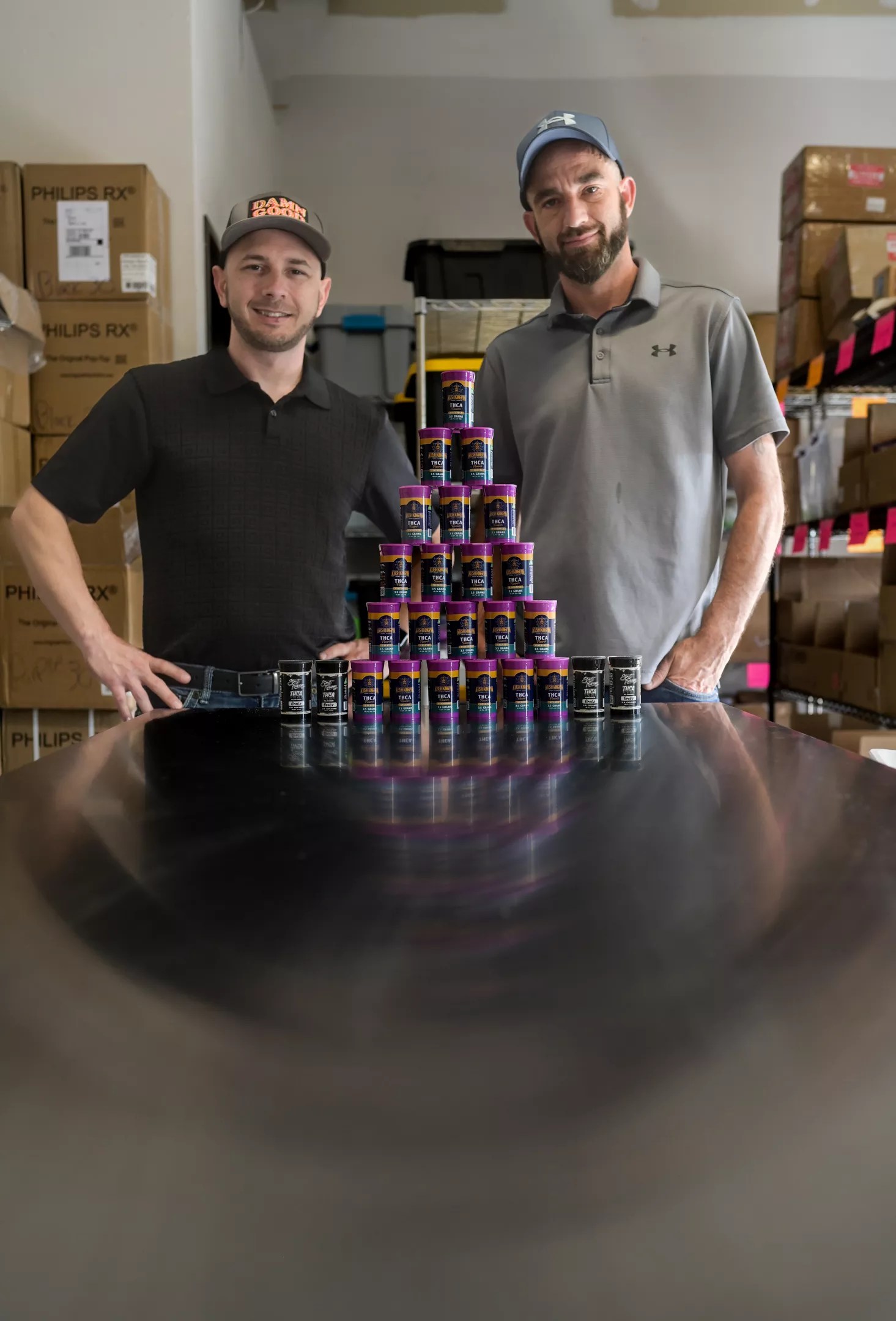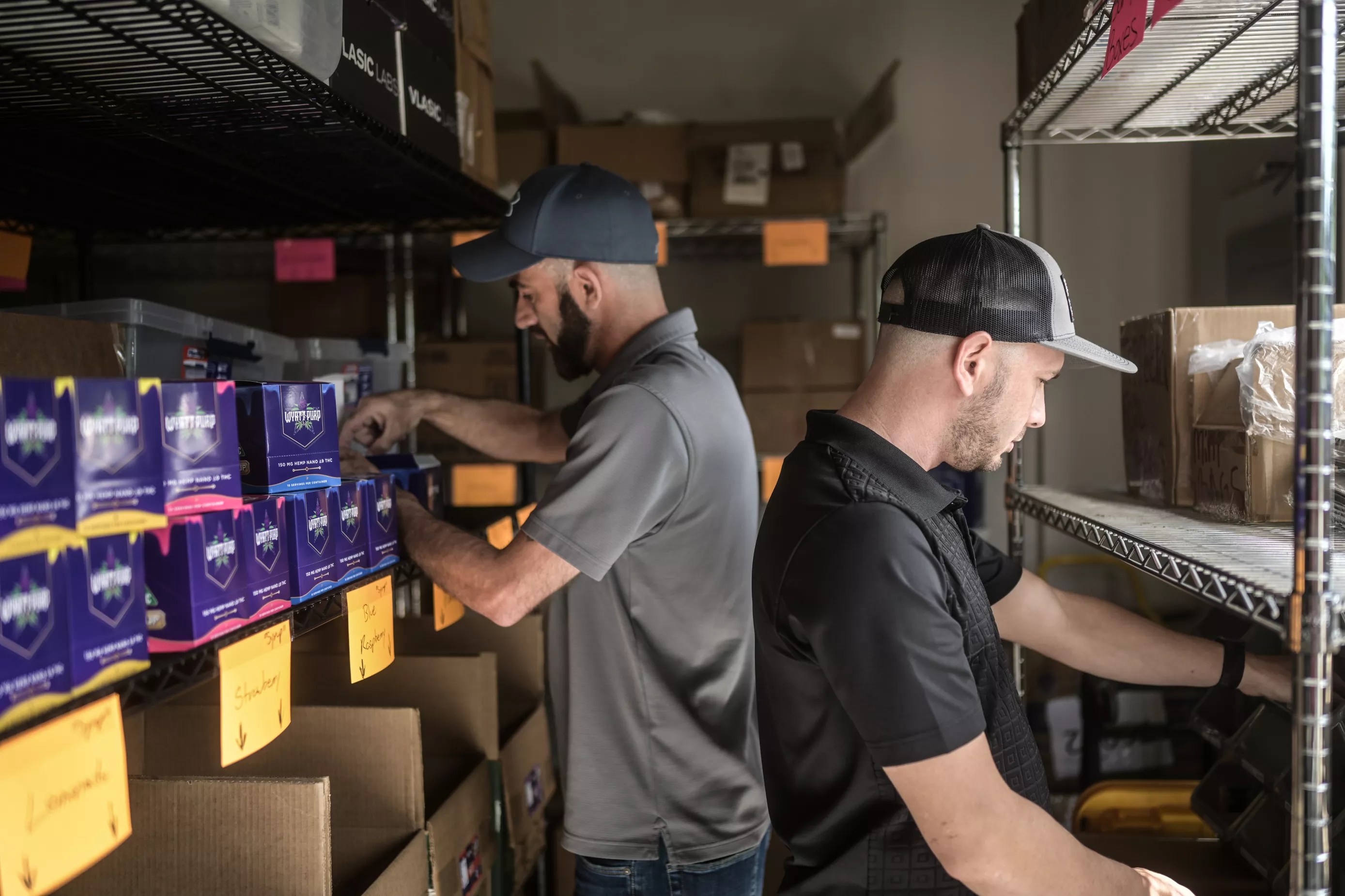 Wyatt Larew (right) and Dustin Ragon stack product in their Bedford, TX warehouse.