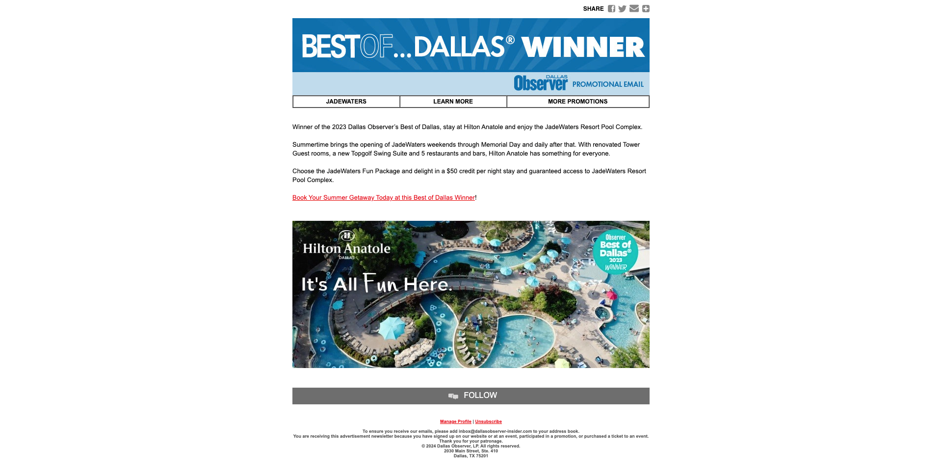 Stay informed about our Best of Dallas® winners with promotional offers and announcements from past and present title-holders. Delivered as needed Monday, Wednesday, and Friday.