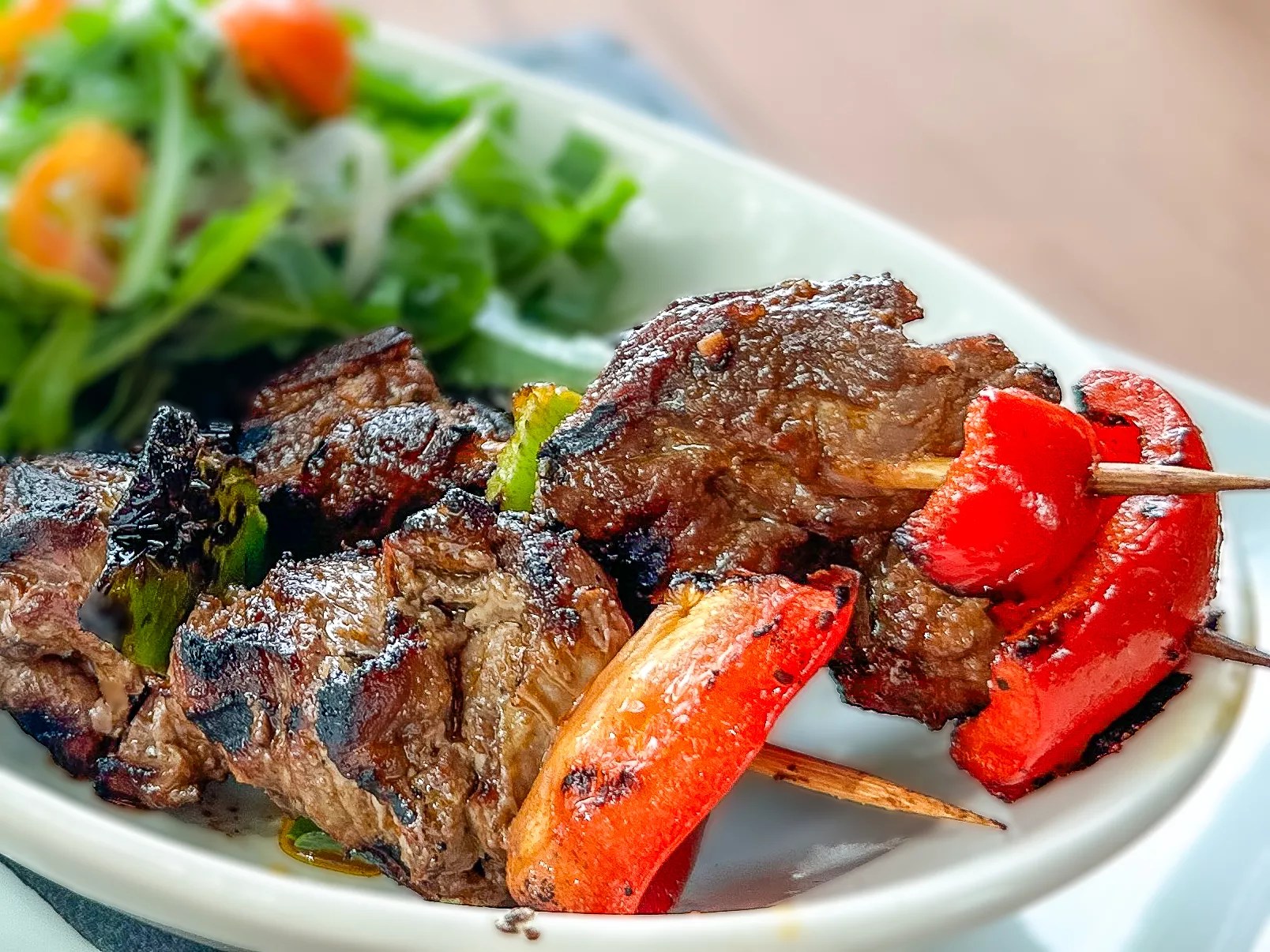 Grilled skewers of beef and peppers marinated in suya sauce.