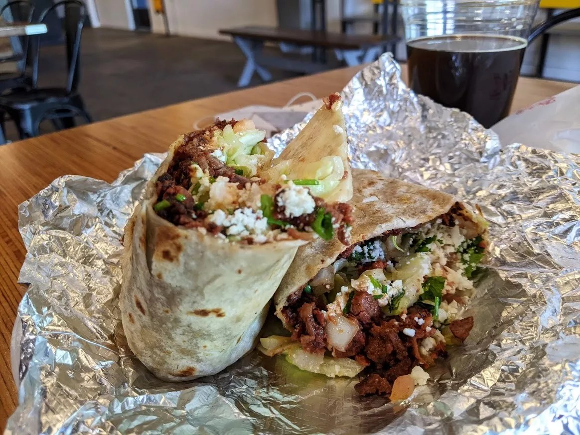Tacos La Gloria’s burrito is a minimalist affair with just meat, cheese, lettuce and cilantro.