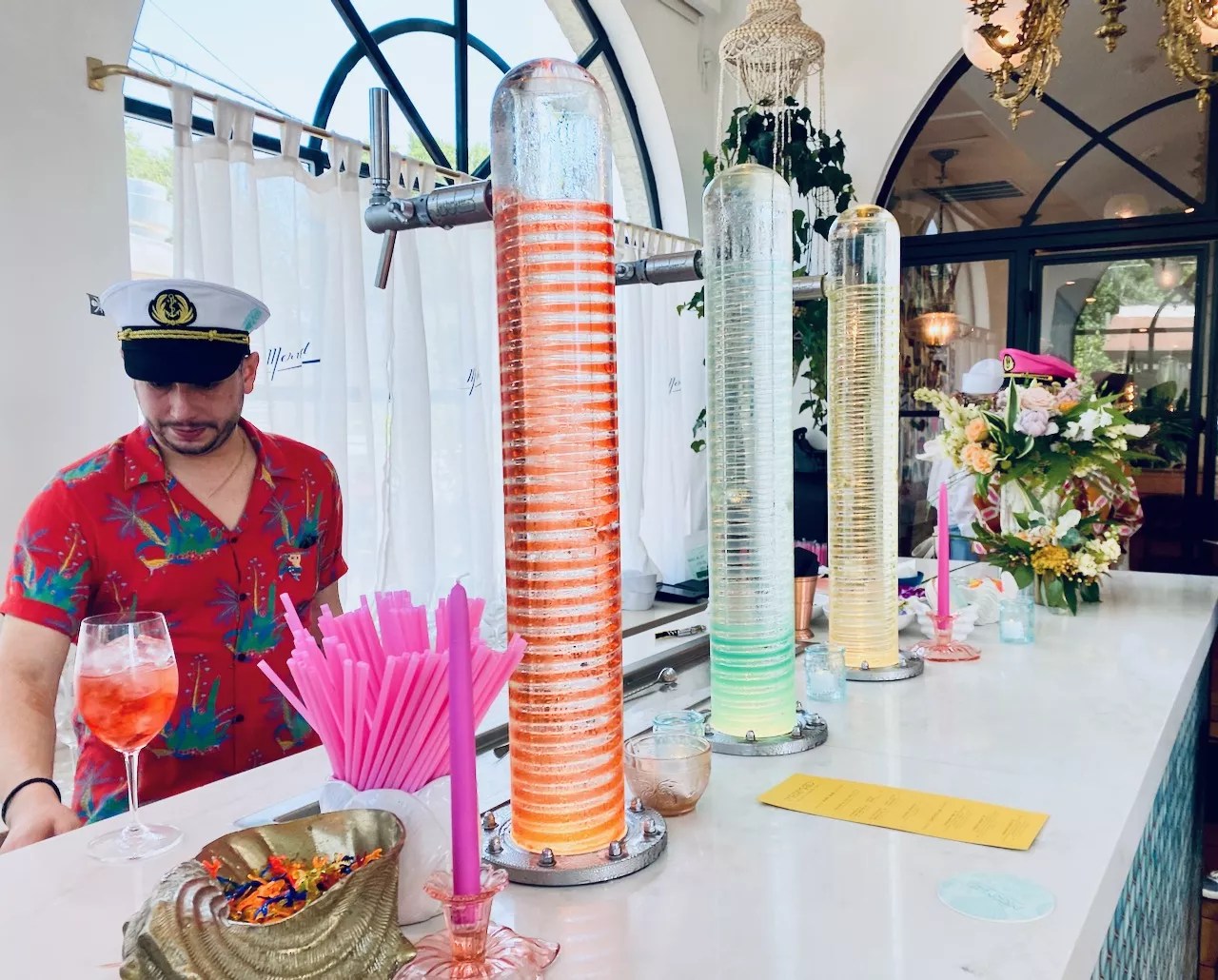 Plus there are bubbles, lots and lots of bubbles, by way of bubble machines spewing soapy orbs into the air and Champagne. The bar on one side of the mermaid den has a small but summer-friendly cocktail list. On the cocktail menu, under the Forever Sunset ($15) it asks, “What if a famous vodka-cranberry and wine spritz had a baby? This might be it.”