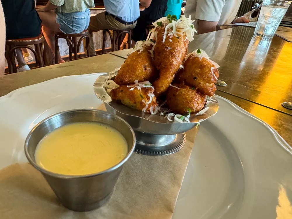 Beverages in hand, we started with cheese beignets ($12). If cheese is your jam, these bite-sized nuggets of fried gruyere, Parmesan and white cheddar are going to be your newest infatuation. A light batter encases the cheese, which is sprinkled with parmesan and served up with – what else? – a cheesy dipping sauce. Cheese-on-cheese action ensues, and if the melty bites were any more addictive, they’d be regulated by the FDA.