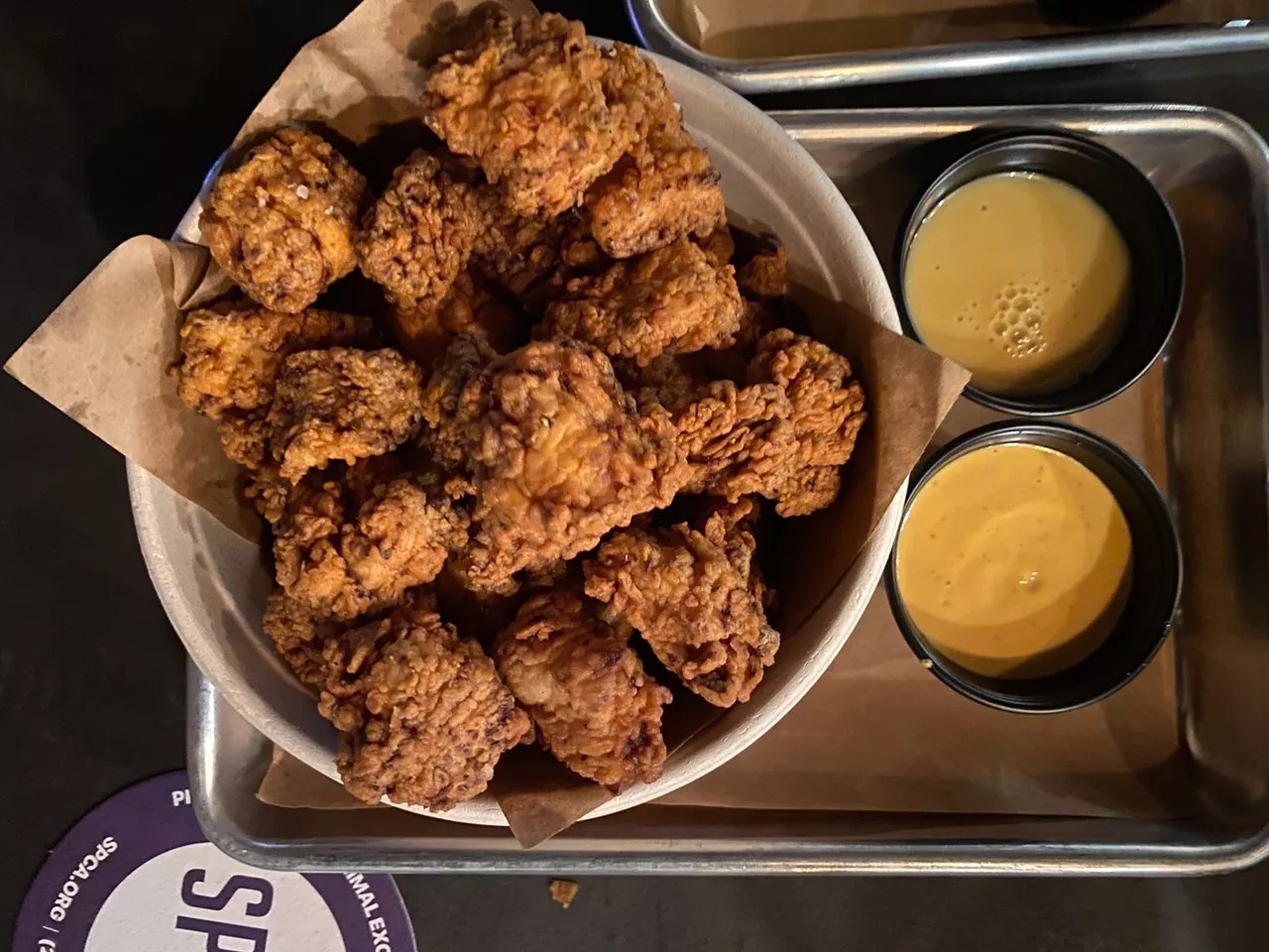 Our eyes were also drawn to the menu section labeled “Nuggies,” which admittedly is a word we don’t see on menus that often. “Nuggies” are either chicken or portobello nuggets, battered and fried, then served by the bowl along with two dipping sauces from a quartet of choices. Intrigued, we opted for the more traditional chicken nuggies ($11) and came away impressed. Each bite of moist chicken was encased in a golden fried casing that managed to be crunchy all the way to the bottom of the bowl without becoming soggy. Odd name aside, a bowl of the addictive nuggies is easily enough for two people to share.
