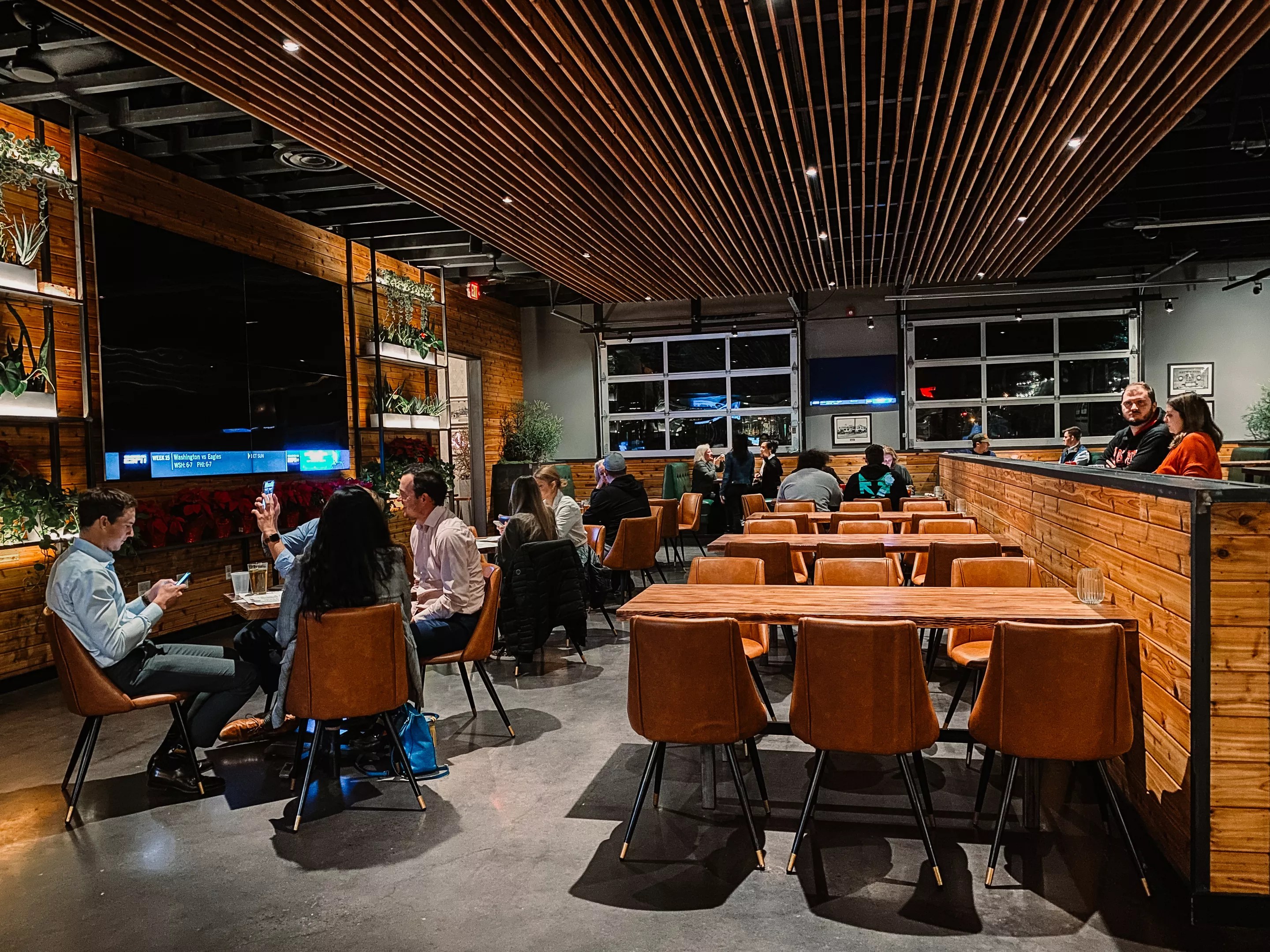 We stopped into Mayer’s on a recent Monday to check out the new space. You won’t find a zoo as you did in 1881, but the new iteration has a modern industrial interior that blends indoors and outdoors seamlessly, thanks to massive garage-style doors that open the patio to the dining room. Inside, the main dining room features plenty of warm wood tables and caramel-colored chairs, which softens the industrial tones. A massive television sits on one wall but is surrounded by wrought iron shelves filled with plants to reinforce the garden name.