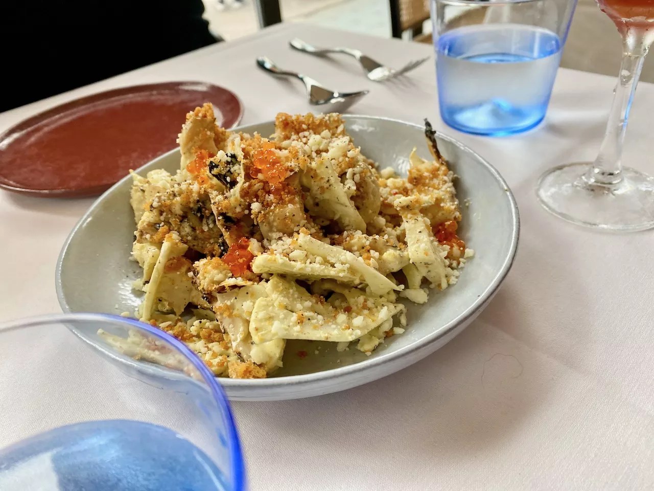 The Caesar salad at Sassetta has a roasted cauliflower base ($16) instead of Romain and is adorned with translucent orange trout roe, sourdough crumbs and pecorino cheese. The roe was mostly eye candy; the delicate flavor didn’t stand a chance with the other pungent players in the dish. Perhaps the most refined of palates could pick it up. Regardless, it was altogether a memorable starter.