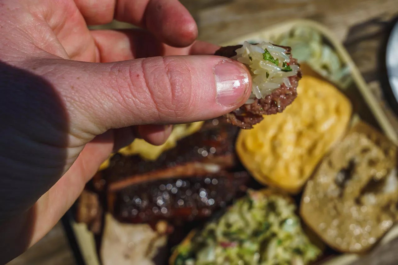 The sauce is hot, but the fresh herbs in the sausage paired with sticky rice help control the heat and give it balance. If you’re looking for the perfect bite, take a slice of sausage, add a little mountain of sticky rice on top and dunk it in the jeow som. Co-owner and pitmaster Lane Milne advises ambitious foodies to try it with a bite of beef rib, rice and jeow som – a tip he gave us after we had already left, meaning now we have to go back.