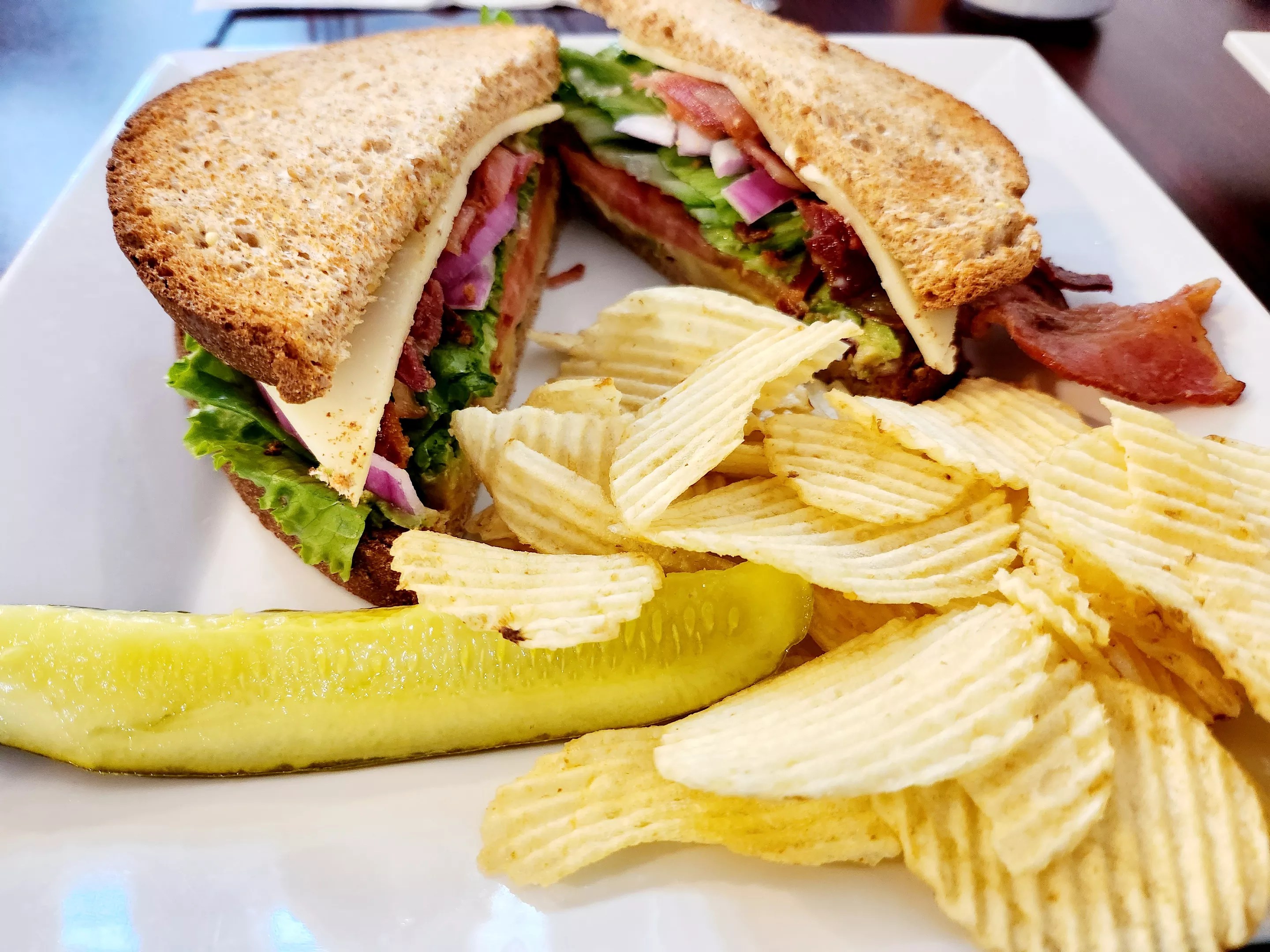 We narrowly missed breakfast hours, so it was lunch for us. We started with the “BATLOC” sandwich ($11.49): bacon strips, avocado, tomato, lettuce, onion and cheese (provolone) on toast. Hence “BATLOC.”