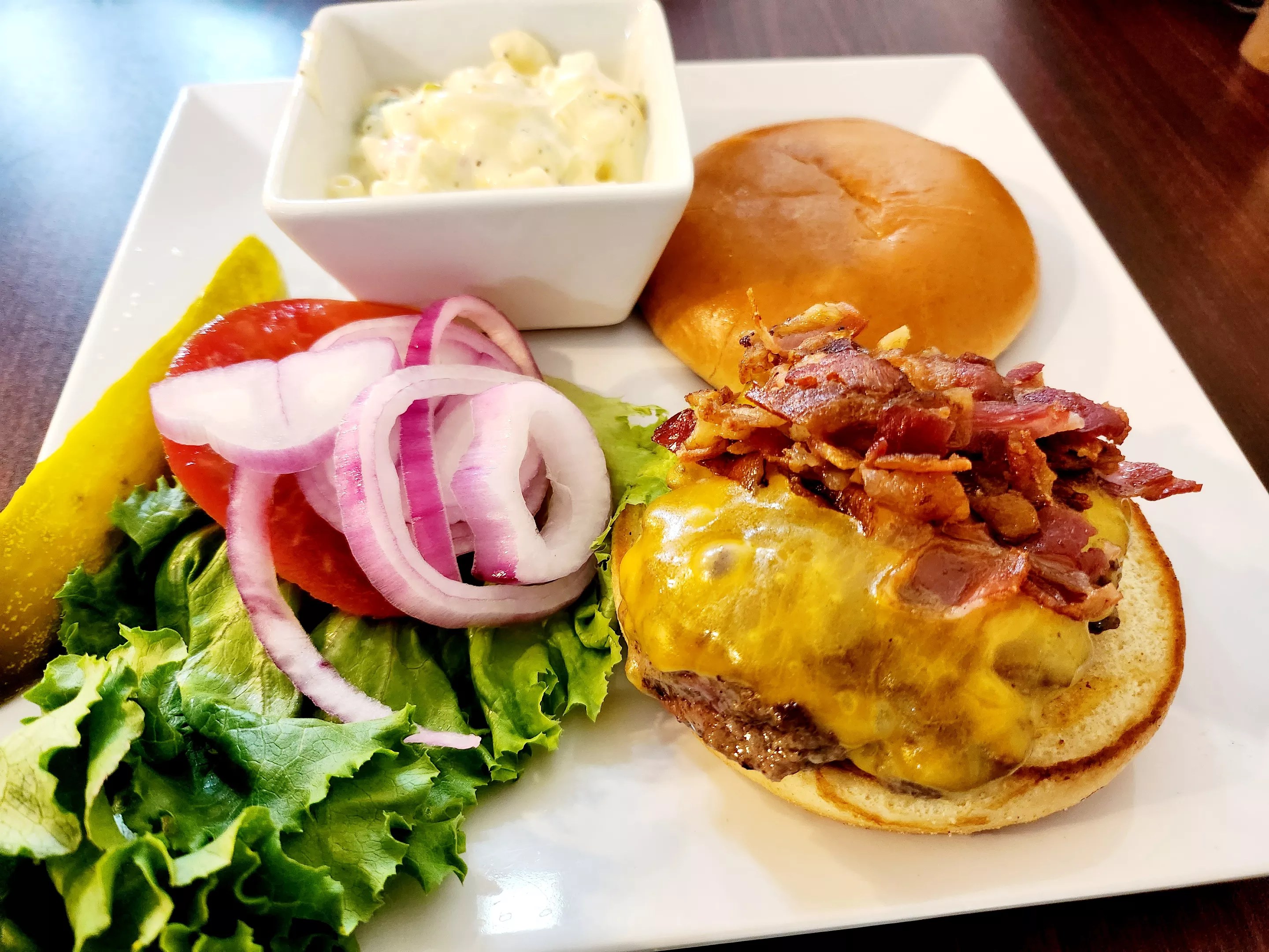 Our next choice was, of course, the John Wilkes Booth burger ($11.49). This house-seasoned, six-ounce beef patty comes on a toasted bun and is topped with melted cheddar and a fistful of bacon crumbles. On the side, you can choose from standard potato chips, macaroni salad, greens or fruit. We suggest the macaroni salad, which was sweet, slightly tangy and tasty.