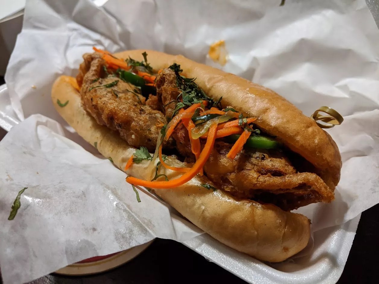 For a first day of service, that was one confident sandwich: crisply battered crab, thick slices of jalapeno, a showering of herbs, not one but two toothpicks to hold things together. The bread is a po’ boy style loaf, with a great deal more squish and give than the awesomely crusty baguettes used at, say, Quoc Bao Bakery.