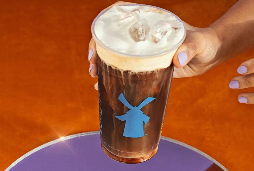 A recent promotional coffee: an Iced White Chocolate Lavender Cold Brew with Dutch Bros cold brew, white chocolate sauce, lavender syrup and a marshmallow-like topping.