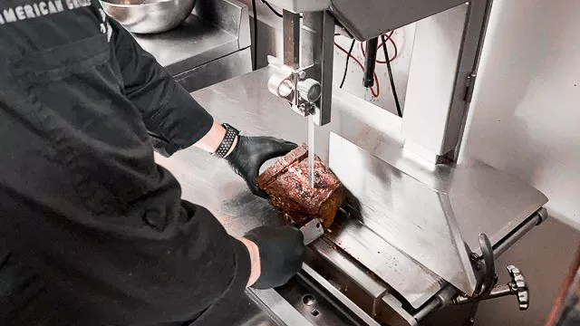 After resting, it’s off to the band saw, where each chop is sliced, trimmed and weighed. The sliced chop is then seasoned again and finished in the oven, which provides the signature flavor and caramelization on the outside. The final prep includes placing the pork chop on a cast iron skillet and covering it with Perry’s signature steak butter and a squeeze of lime. A cloud-soft scoop of mashed potatoes joins the chop along with a house-made applesauce.