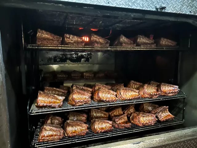 The chops are trimmed and seasoned, placed in the in-house smoker – which holds dozens of chops at a time – and left for four to six hours. As each chop is removed from the smoker, it is temperature checked and rested.