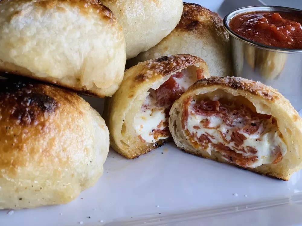 Pepperoni puffs served with organic tomato sauce and garlic mascarpone cheese ().