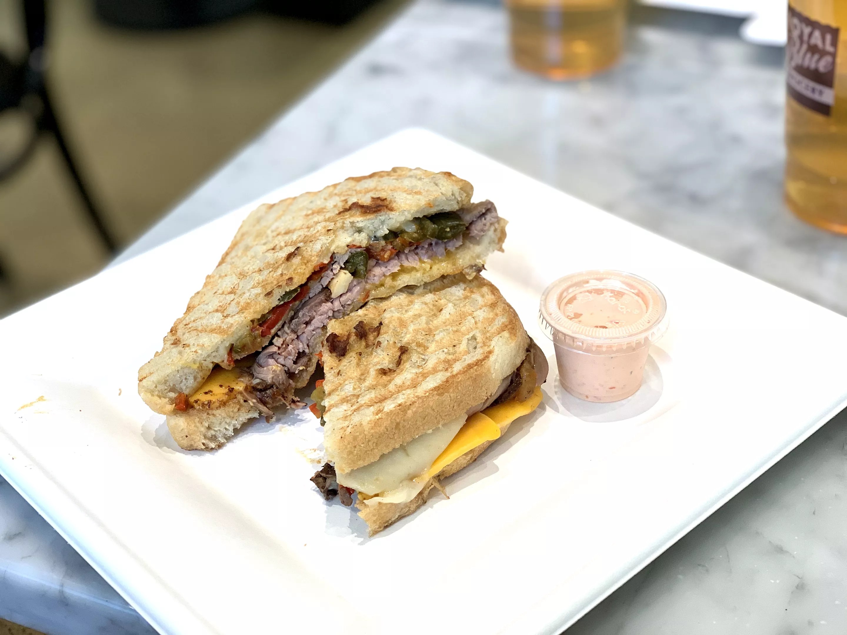 The Texas Hold ‘Em: Roast beef, peppers, onions, pepper jack cheese and melted cheddar on pressed Empire Baking bread (pictured back in the day when we could eat in restaurants)