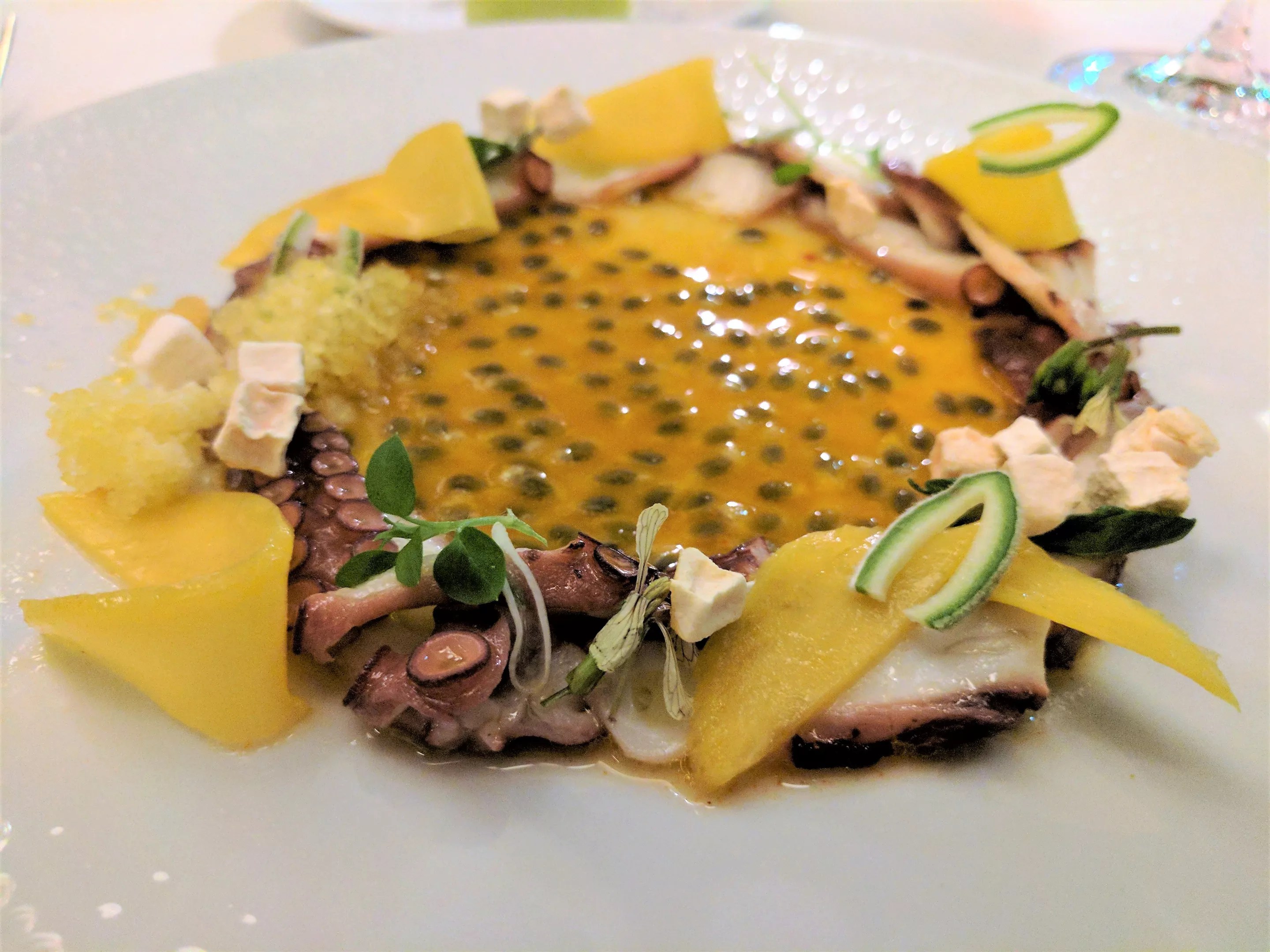 A recent addition: a ring of thin smoked octopus slices topped with freeze-dried papaya (the little gray-white cubes) and green almond slices, all around a passion fruit coulis.