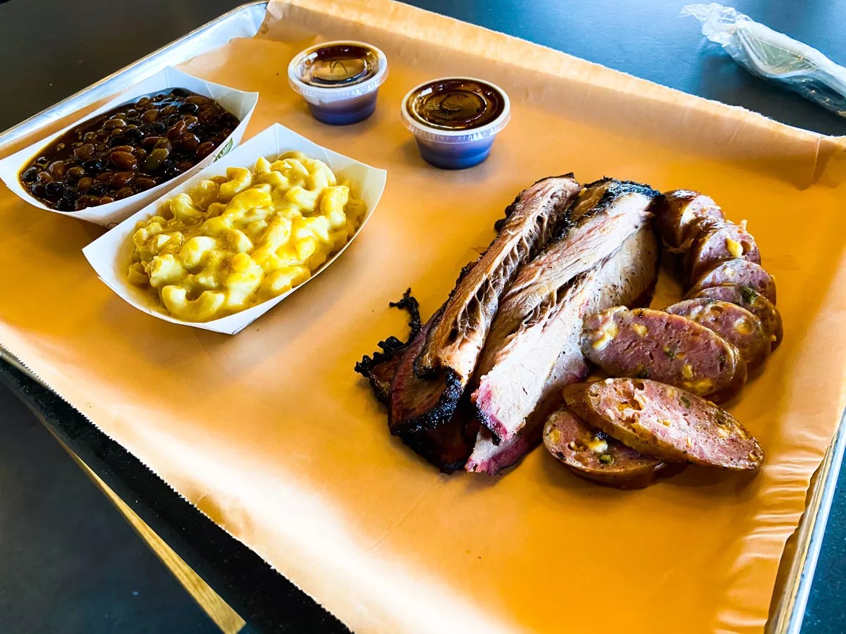 Despite not getting a choice of lean or fatty from the meat slicer, we were pleasantly surprised by Sugarfire’s brisket. Our lean slices oozed moisture with each pass of the meat cutter’s knife, and the beef carried a solid smoke flavor. We also picked up bits of sweetness from the ebony bark. The sausage breaks no ground in originality, but the flecks of pepper gave each succulent bite an appreciable kick.