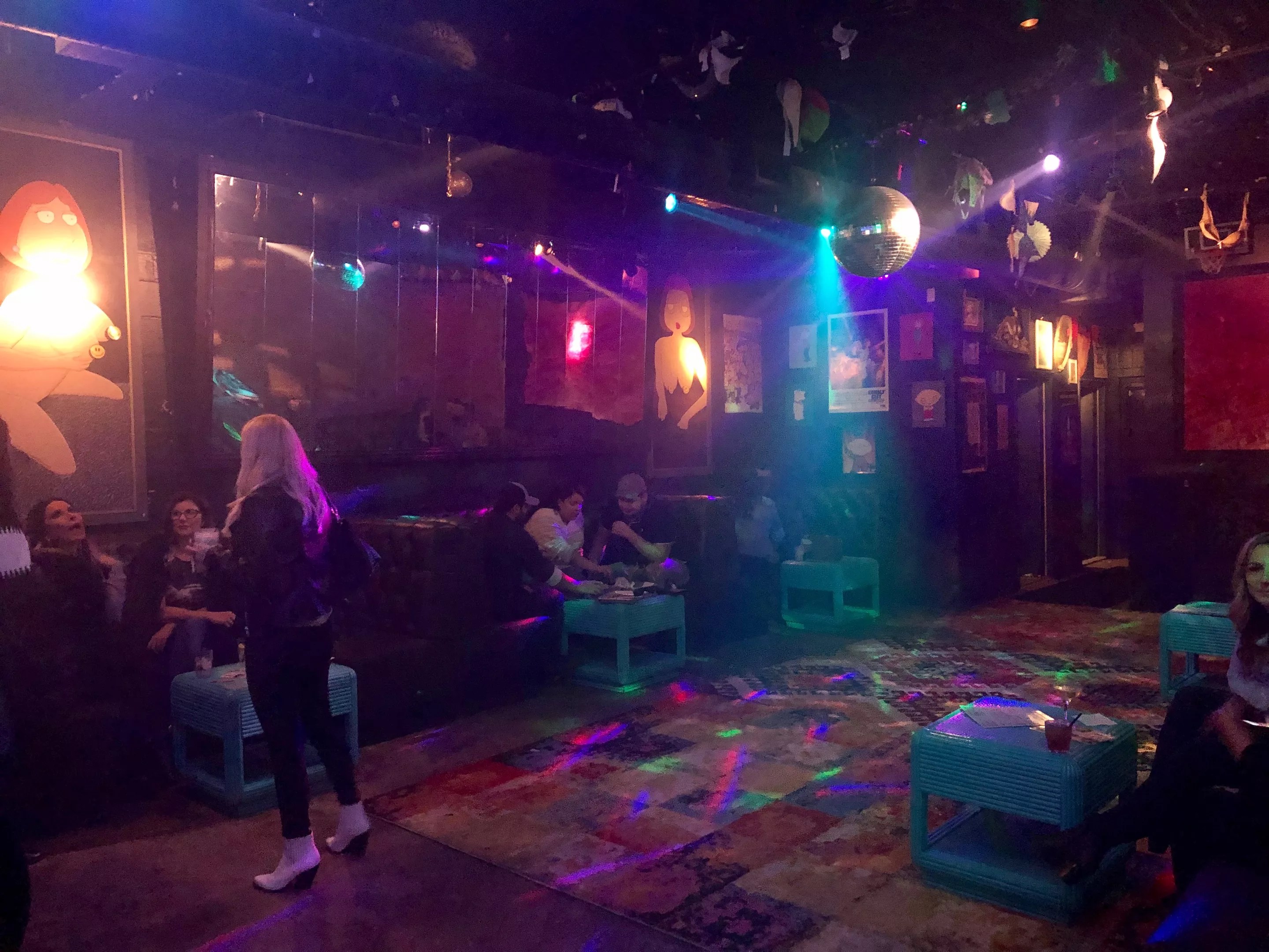 In the back of the room is a twirling disco ball that reflects light into enough smoke machine fog to fill your sinuses a bit, but attempts to set some kind of mood. Also in that space are cozy booths: ones with large pictures of Lois and Meg pasted above. Nude. With pasties.