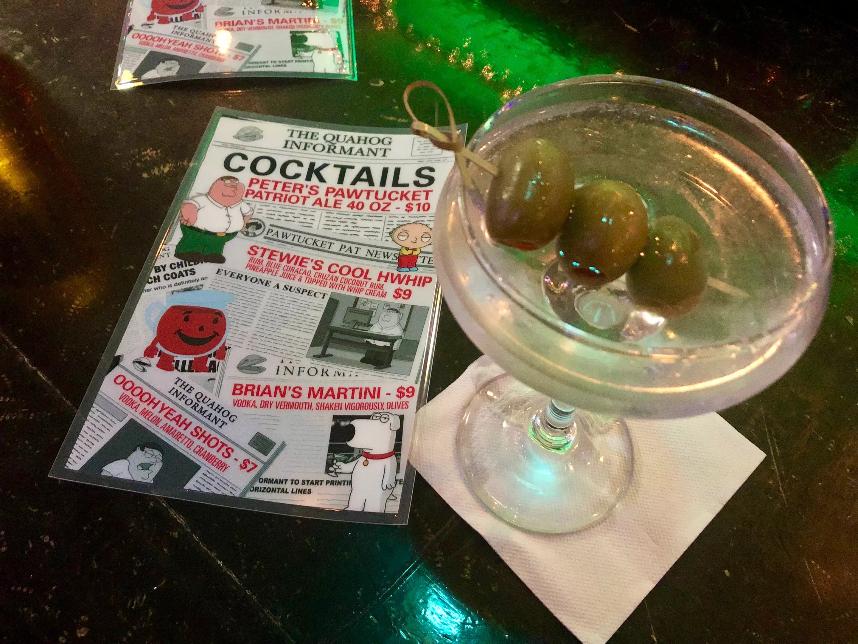 Along with the decor and TVs playing the show, you’ll find a small themed cocktail list. Forty ounces of “Peter’s Pawtucket Patriot Ale” (Miller High Life) gets you an embarrassingly large bottle for $10 – but it has the “Patriot Ale” branded label on it, so it’s cool.