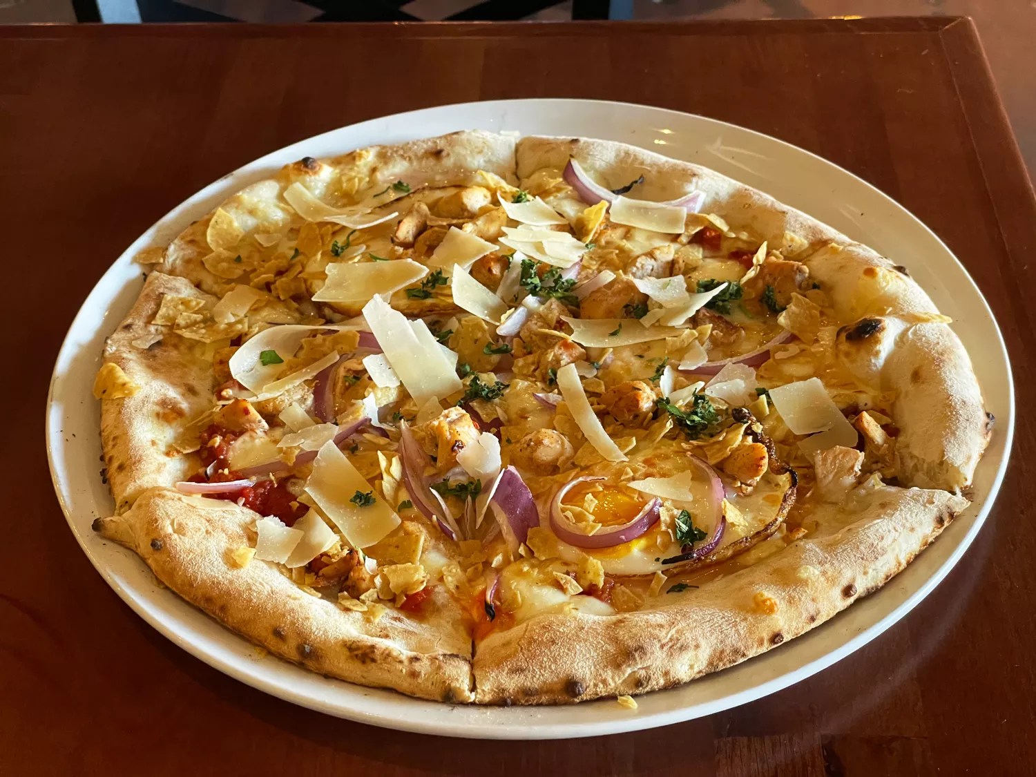 We also ordered the Migas Pie, made with housemade mozzarella, spicy tomato salsa, roasted chicken, red onion, sunny eggs, crushed tortilla strips and parmesan. It’s surprisingly light for what’s packed onto this thing, and we suspect the old-school pizza with a bacon gravy base is just as good.